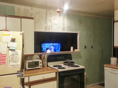 Tonight I want to finish up our kitchen project. Yesterday we got the wallpaper hung. Although, I never thought I would ever hang wallpaper again. Today I started painting the walls a lighter color over top of the light green walls. Don't get me wrong, I love the color of green, but this color had to been given to the person who painted this room. No one would have bought this on purpose, mismatched paint or not. I went with a white with beige undertones on the wall and it's amazing how much it brightened the room.